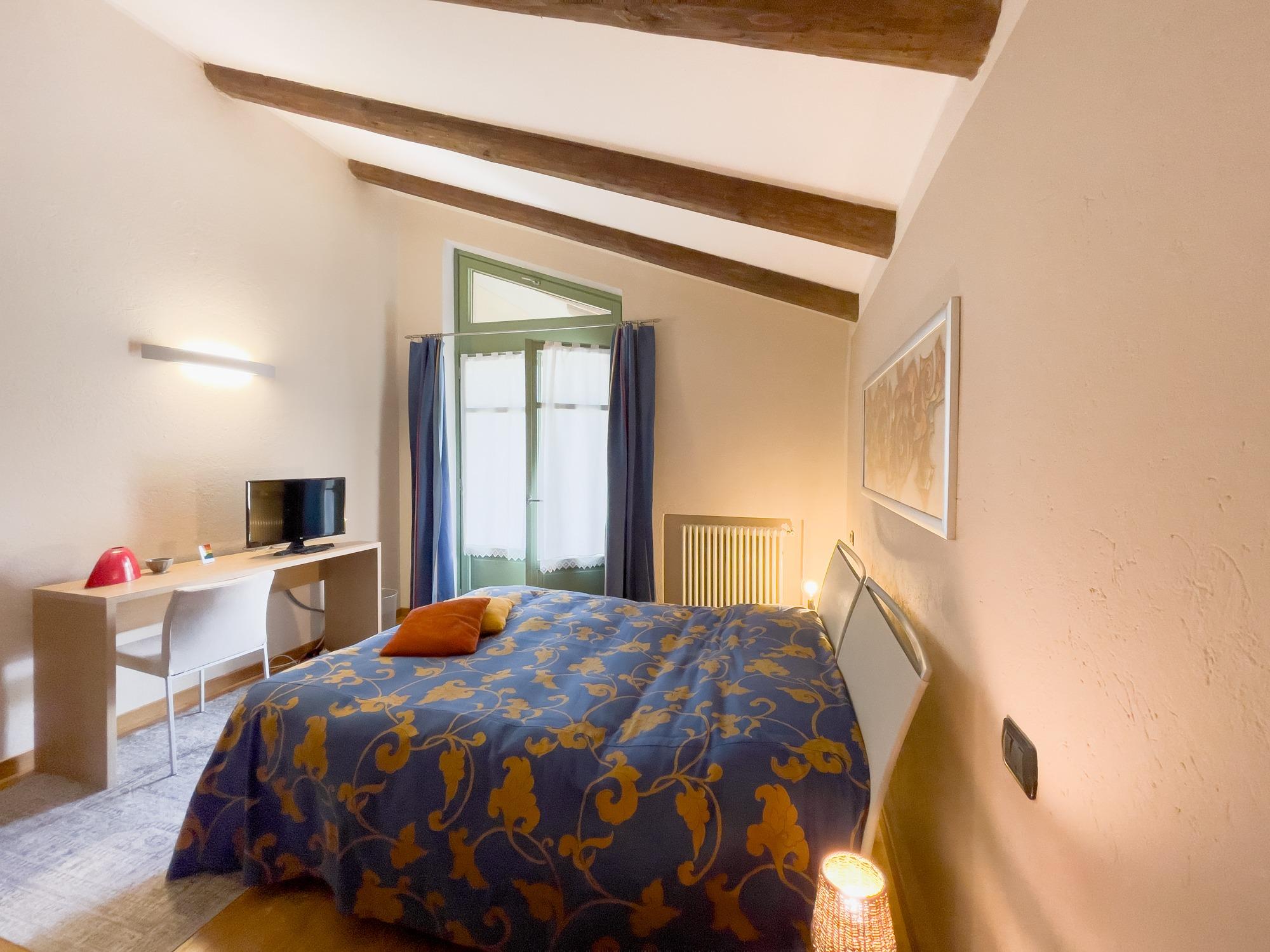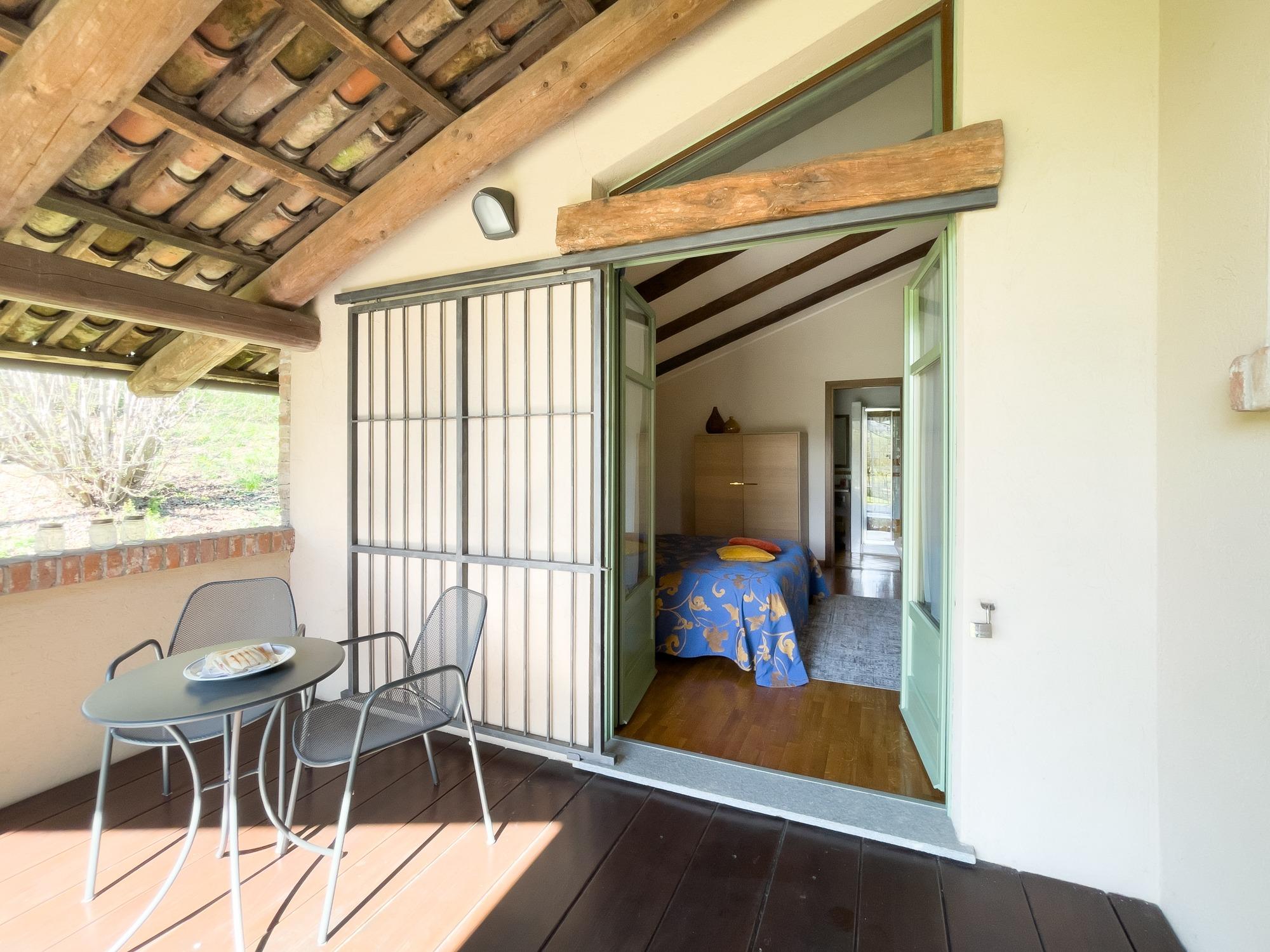 La camera Dany è una matrimoniale che offre un ampio terrazzo privato, perfetto per chi desidera rilassarsi godendo di una splendida vista sul verde.